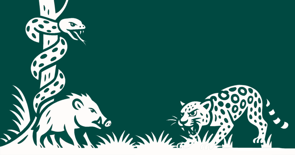 O queixada frequentava aquele local da floresta com frequência, e cada vez mais se afastando dos demais da manada, a sucuri não entendia os motivos que levavam o queixada na densidade da floresta e também não a interessava, se banquetearia, e ficaria de pança cheia por muitos dias.